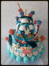 +/- 130 bonbons : étoile twist bleu, chamallow rose, baleine, coquillage...